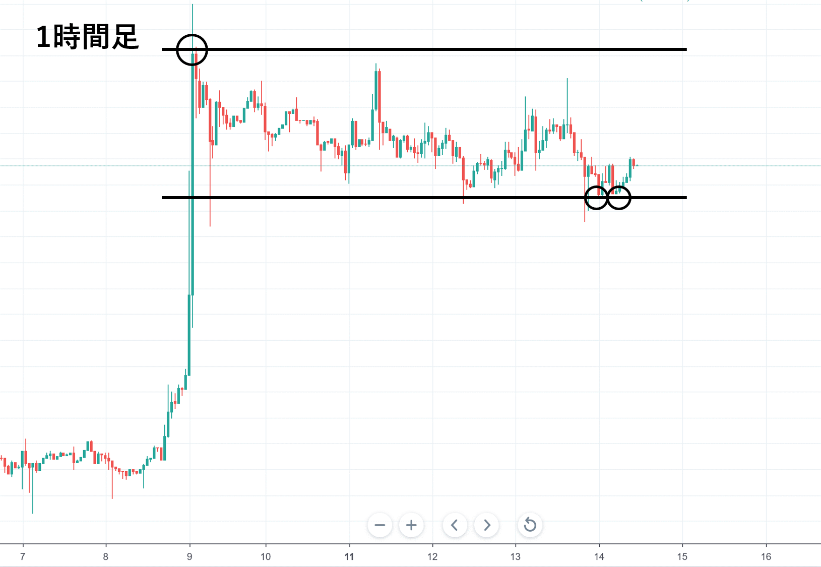 この時ローソク足の実体とヒゲ先のどちらにラインを合わせるべきかという問題が出てきますが、サポレジラインはあくまで価格帯を把握することを目的としているため、正確に引くことを意識する必要はありません。